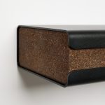 The frame is 2 mm black powder-coated steel. The drawer is pressed smoked cork — soft, durable, and natural.